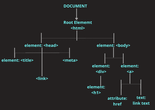 Each element within the HTML file (such as <body>,<head>, <title>,<div>, <section>, <h1>,<p> etc.) becomes a separate node in the tree which are children of the root node (document).